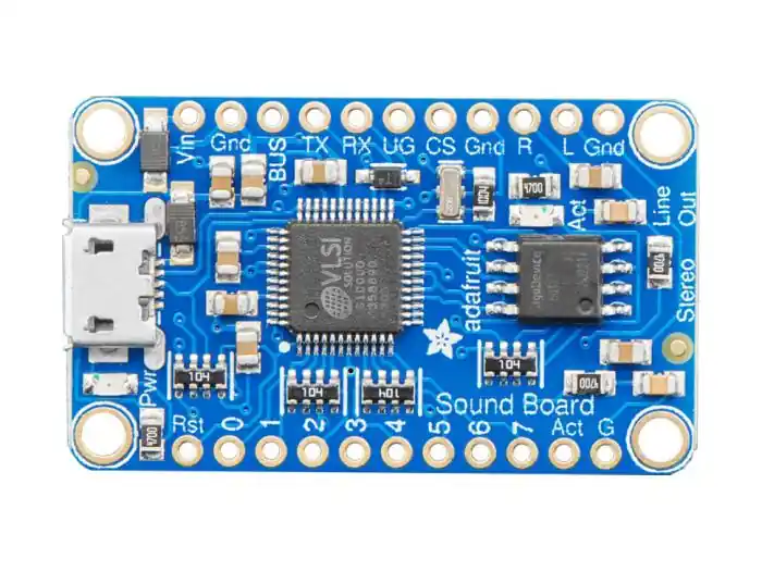 Adafruit Mini Sound board är ett litet och smidigt kort som på ett enkelt sätt låter dig lägga till ljudeffekter till ett projekt, vare sig det är en kostym, en installation eller helt enkelt knappar som spelar upp ljudfiler. Ingen programmering krävs, ljudfilerna döps enligt ett enkelt system och spelas upp på upp till fem olika sätt (en gång, loop medan knapp hålls nere, loop tills knappen trycks igen, en lista av upp till tio ljudfiler som spelas efter varandra, eller en lista med upp till tio ljudfiler som spelas slumpmässigt).