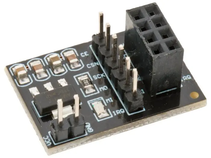Litet adapterkort som gör det enklare att koppla in nRF24L01-moduler. Kortet bryter ut alla anslutningarna till en stiftlist och en spänningsregulator gör att man kan driva modulen med 5V.