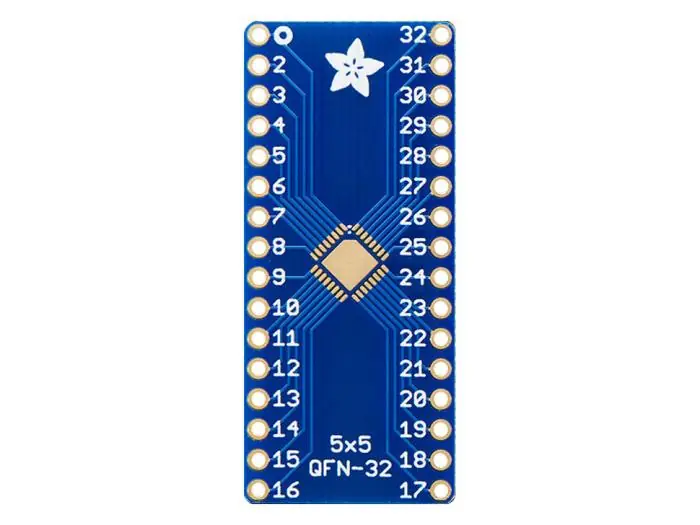 Adapterkort för att konvertera en ytmonterad QFN-32 eller TQFP-32 krets till hålmonterad. Ena sidan av kortet har plats för en QFN-kapsel (5×5) den andra har plats för en TQFP (7×7).