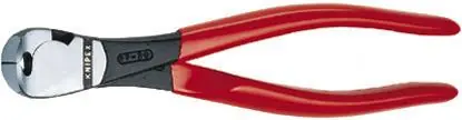 Polerad ändavbitare för pianotråd, med enkel led och plastklädda skänklar.