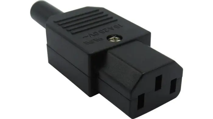 Svart apparatkontakt med skruvanslutning och dragavlastning. Max 250V AC, 10A.