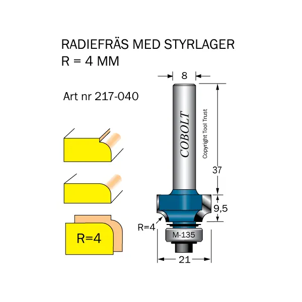 Cobolt 217-040 är en avrundningsfräs för avrundning av massiva trä- eller plastkanter inom möbeltillverkning, stomkonstruktioner, snickeri- och inredningsarbeten. För dekorativ och ergonomisk formning av kanter på fönsterkarmar, skåp, bordskivor, ledstänger, räcken och hyllor. Vid fullt utnyttjande av arbetslängden kan man göra klassiska stavprofiler. Kullager gör det möjligt att styra fräsen direkt på materialet, även rundskuren kant.