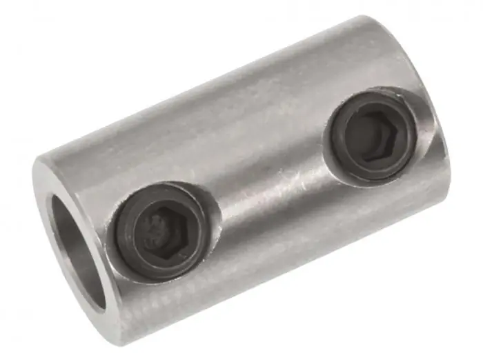 Koppling i rostfritt stål för att fästa en 1/4″ (6.35mm) axel till en 3mm axel. Kopplingen har två stoppskruvar för att fästa axlarna.