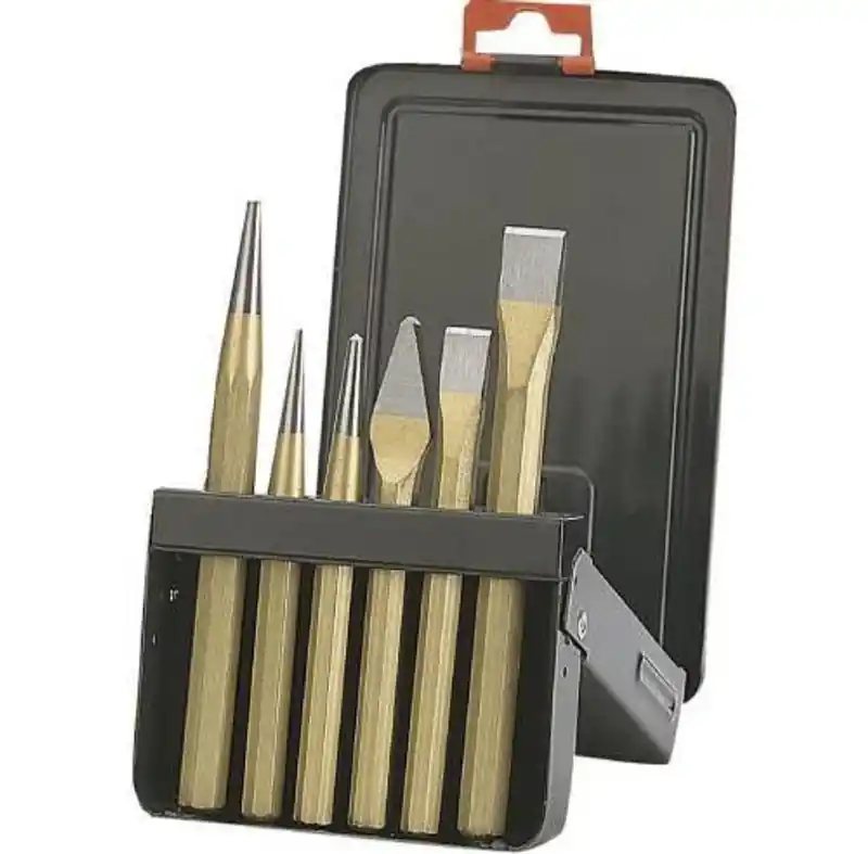 Bahco sats i 6 delar med mejslar, körnare och dorn. Av lackerat kopparfärgat vanadin extra stål med specialhärdad slagände. I lackerad antracitgrå metallask