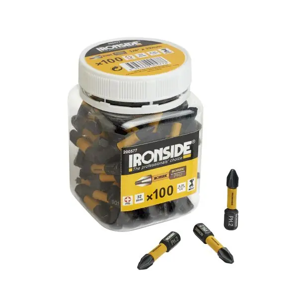 Ett 100-pack torx kraftbits med torsionszon och 1/4″ sexkantfäste. Bitsen är svartfosfaterade.