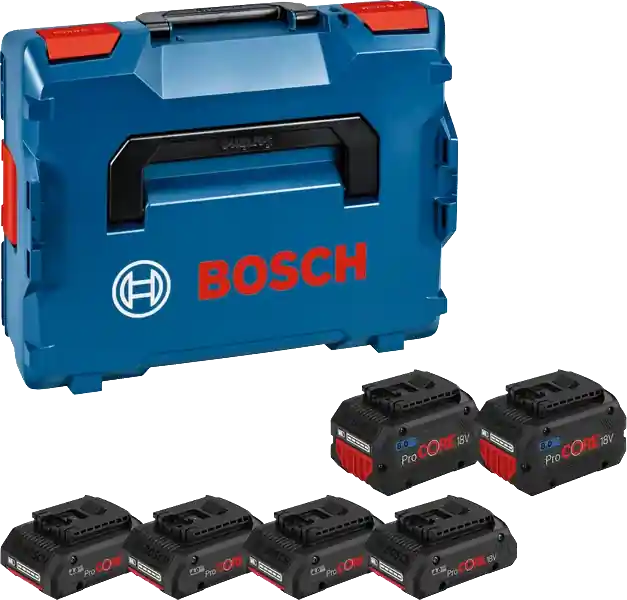 Ett batteripaket från Bosch innehållande 4 stycken kompakta och lätta ProCORE18V 4,0 Ah-batterier, 2 stycken högpresterande ProCORE18V 8,0 Ah-batterier och L-BOXX med insats. ProCORE18V 4,0 Ah och 8,0 Ah-batterier är utrustade med en högupplöst laddningsindikator med fem LED-lampor. COOLPACK 2.0-tekniken hos dessa batterier med sin överlägsna värmehantering garanterar längre livslängd och drifttid. L-BOXX 136 med sin särskilda insats ger bättre förvaring och transport i enlighet med Bosch Mobility System. För bekväm hantering kan staplade boxar enkelt öppnas med den förbättrade L-BOXX-klickmekanismen.