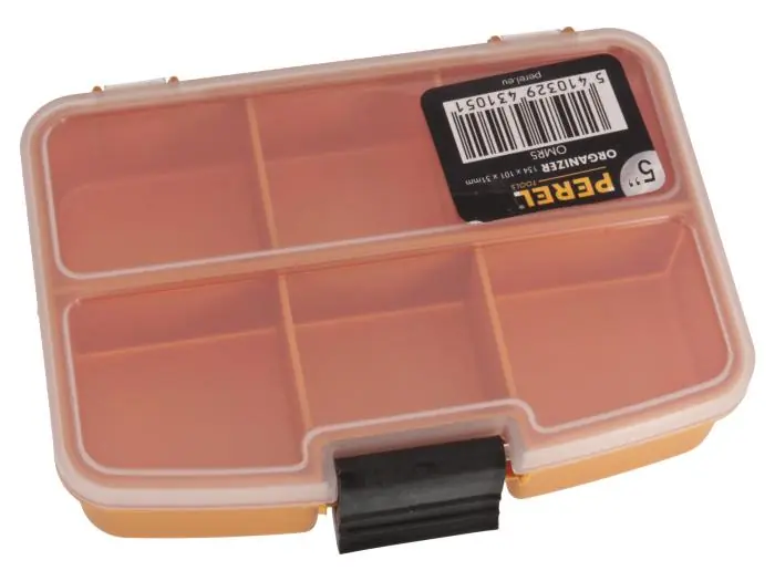 Förvaringslåda för mindre komponenter med snäpplås. Lådan har 6 fasta fack om ca. 40 x 40 x 25mm. Komponenter säljes separat.