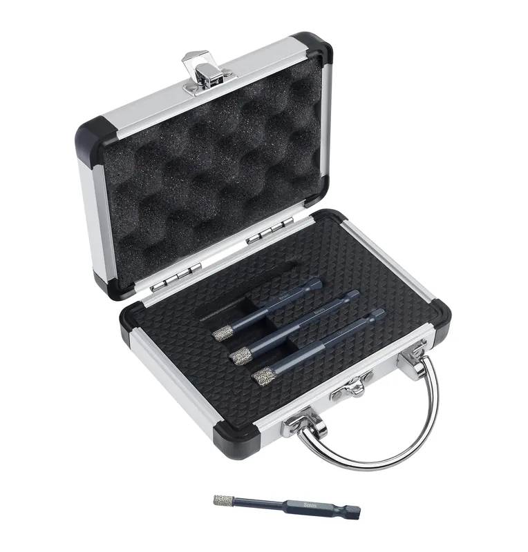 Diamantborrset med fyra diamantborrar som har hex-fäste. Lämpliga för borrning i granitkeramik, kakel och all sorts natursten utan vattenkylning. Om du med jämna mellanrum, under håltagningens gång, kyler av borret förlänger du livslängden.