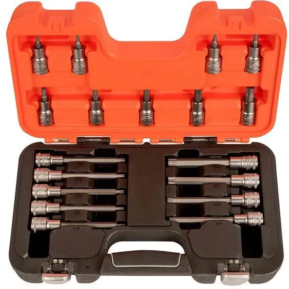 Bahco S18TORX är en 18 delars bitshylssats på 1/2″ med långa och korta bitshylsor för Torx-skruv i storlekarna T20, T25, T27, T30, T40, T45, T50, T55 samt T60. Levereras komplett med väska.