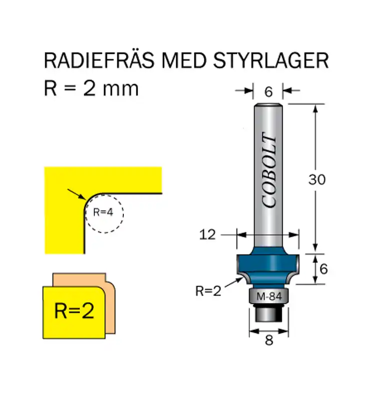 Radiefräs med styrlager M-84. Används för avrundning av massiva trä eller plastkanter inom möbeltillverkning, stomkonstruktioner, snickeri- och inredningsarbeten. Har styrlager med liten diameter för styrning i trånga utrymmen och det ger även bästa åtkomligheten vid fräsning inom en liten radie.