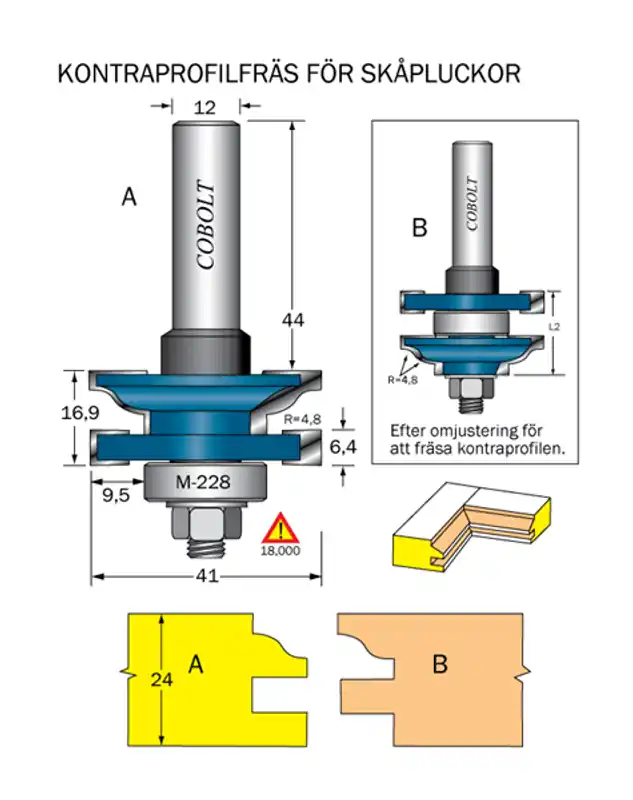 Cobolt kontraprofilfräs med en spindeldiameter på 12mm för att fräsa t.e.x skåpsluckor. Kontraprofilfräsen håller hög kvalité och ger lång livslängd.