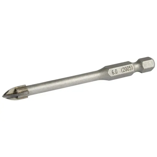 En förzinkad 4-skärs kakelborr för borrning i mycket hårda plattor, klinker och liknande. Borren skall gå långsamt och bör kylas med vatten. Rekommenderad hastighet, beroende på ytans hårdhet, är 750-2000 rpm.