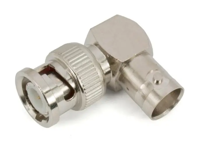 BNC vinkelkontakt hane/plugg-hona/jack. Hölje i nickepläterad mässing, POM dielektrikum och guldpläterad mittledare.