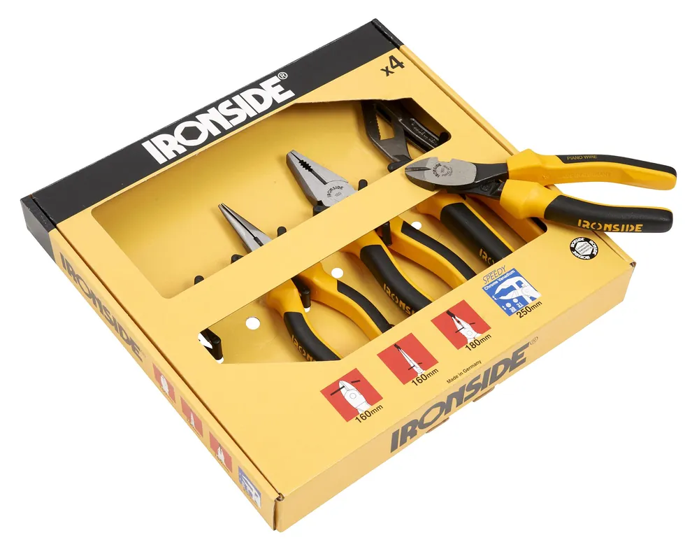 Ett 4 delar tångset av kromvanadinstål med polerat skyddslackerat huvud och ergonomiskt utformade grepphylsor av tvåkomponentsmaterial. Setet innehåller en polygriptång, en kombinationstång, en sidavbitare samt en spetstång.