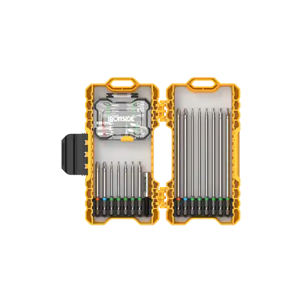 Plastkassett innehållande: Bitshållare 60mm med magnet samt 39st ¼” S2+ bits med zinkfosfatering och färgkodning:
