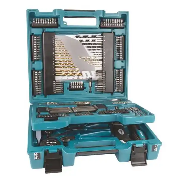 Härligt 200 delars borr- och bitset i väska med mur-, trä- och metallborrar, bits, mattkniv, måttband, vattenpass, ficklampa m.m.