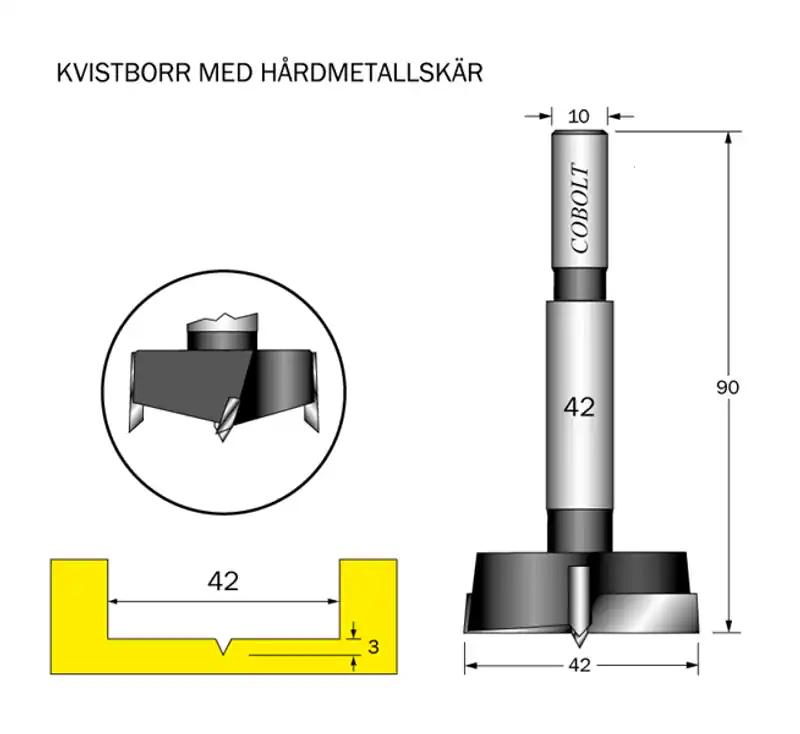 – Fo?r borrning av ha?l med plan botten i ha?rda massiva tra?slag, typ ek, MDF, spa?nskiva och o?vriga ha?rt slitande material.