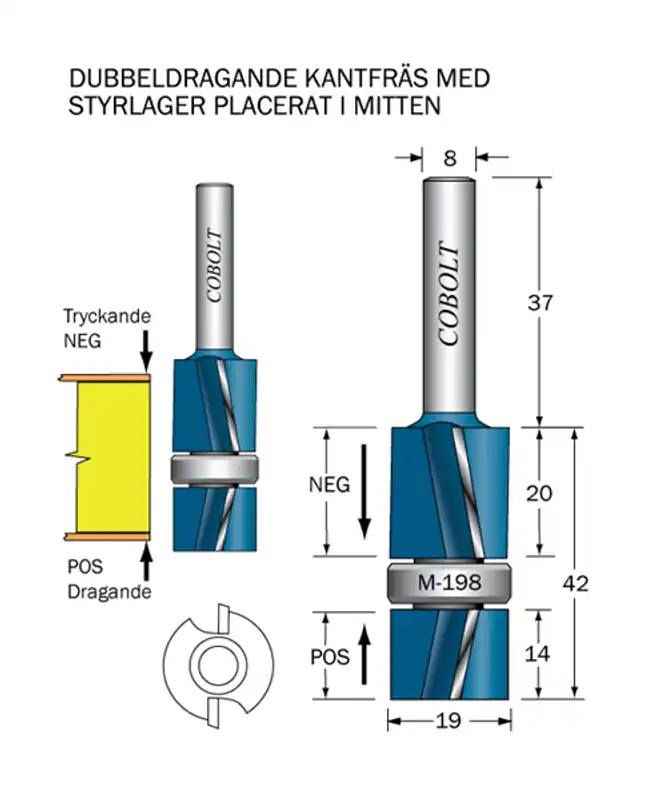 – Snedställda skär som är både tryckande och dragande för att undvika flisning på båda sidor av materialet.