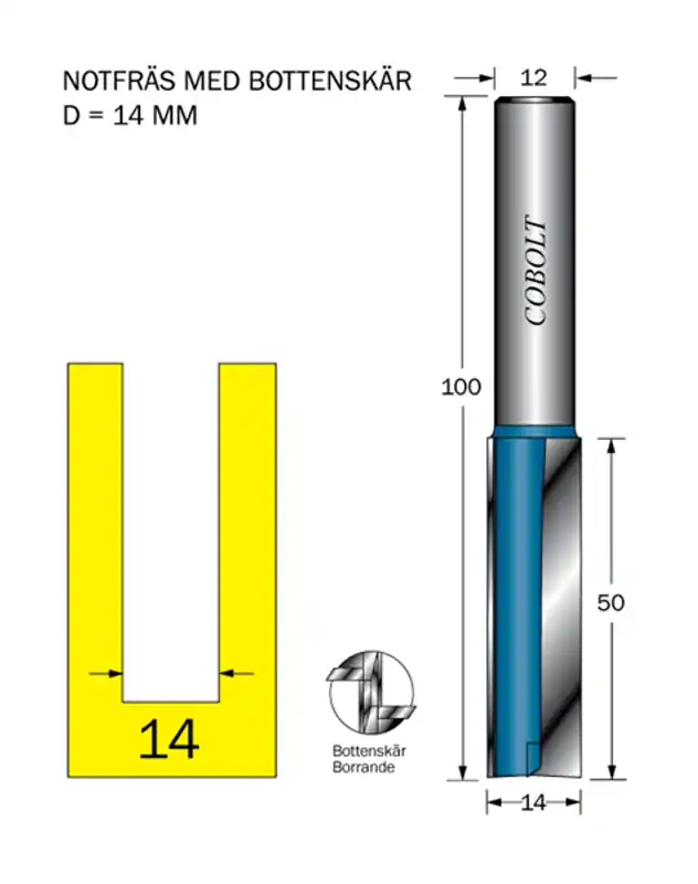 Borrande notfräs med infällt bottenskär, orienterat 90 grader till sidoskären och sammanslipat med dessa, vilket medger effektiv borrning rakt ner i materialet, även i hårda träslag och laminat.