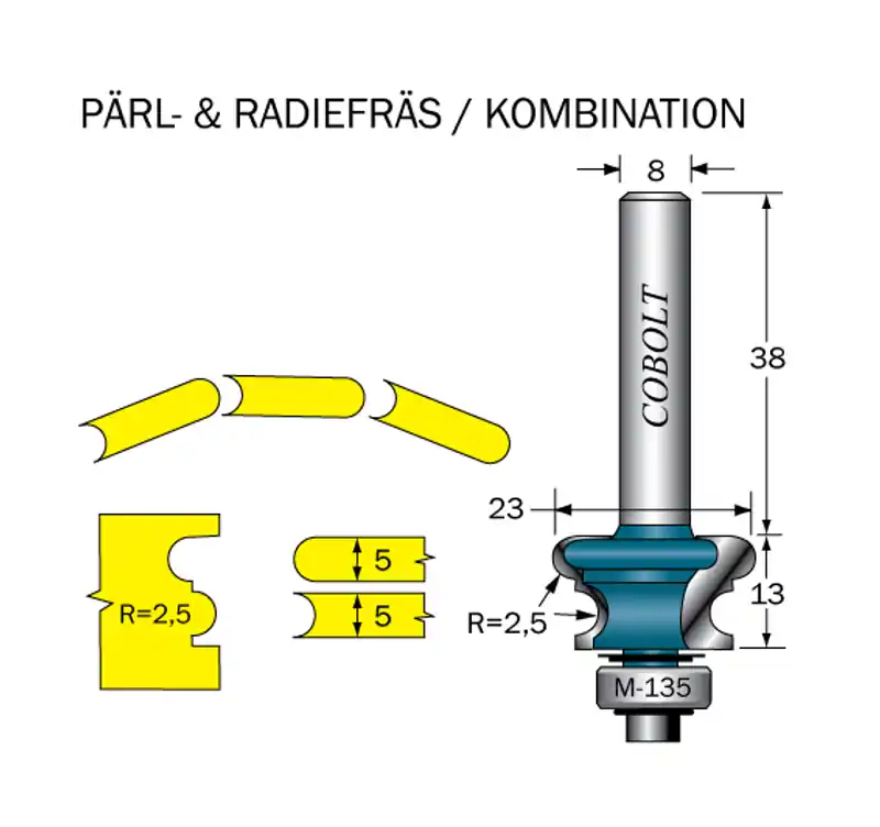 Cobolt pärl- & radiefräs har en matchande konvex och konkav radie. Passar utmärkt till att forma en typ av låsfog som används vid bygge av kajaker.