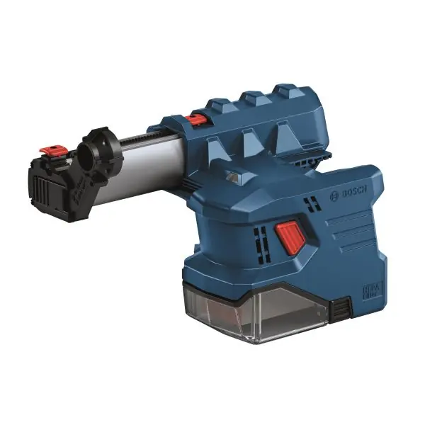 Bosch GDE 18V-12 är en dammadapter på 18 V som är enkel att använda, även vid borrning över huvudhöjd. Inandning av damm och en stökig arbetsplats är en del av utmaningen med att borra i betong. Bosch har utvecklat GDE 18V-12 Professional dammutsug för arbete med mindre damm och hål mellan 6 mm och 10 mm. Du kan manövrera dammutsuget med en hand tack vare stora och ergonomiskt utformade upplåsningsknappar. LED-lampa är centrerad direkt mot borrytan och gör att du kan se bättre när du jobbar.