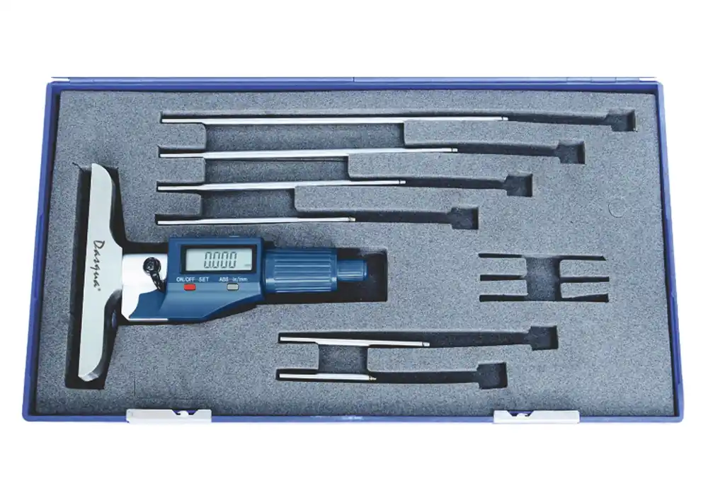 Dasqua 509523 är en digital djupmikrometer med stor och tydlig display. Djupmikrometern har ett mätområde mellan 0-150 mm / 0-6″ och avläsning 0,001 mm / 0,00005″. Tillverkad enligt standard DIN 863. Försedd med utbytbara härdade mätspetsar för större mätområde med samma instrument.