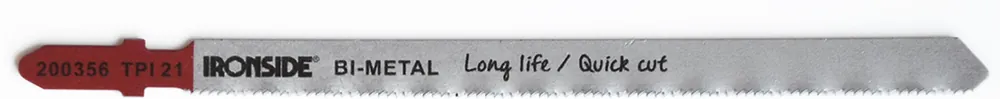Högkvalitativ Bimetall tandning. Sticksågsblad för snabba skär. Standard för Metall 2-6 mm. Tunnplåt (1-3 mm), sandwichmaterial (<65 mm), rör + öppna profiler, inkl. aluminium (Ø <65 mm). Vågformat, fräst 318AF Bimetall M51.