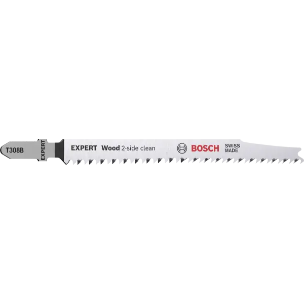 Finsnickare och träarbetare har alltid satt en ära i att se till att den ”rena sidan” av ett sticksågssnitt hamnar på den synliga delen av arbetsmaterialet. Ibland går det att vända på arbetsstycket. andra gånger kan sticksågen helt enkelt hållas upp och ner. Eller så kan du använda EXPERT ’Wood 2-side clean’. som erbjuder perfekta snitt utan flisning på båda sidorna. tack vare dubbla tandrader.