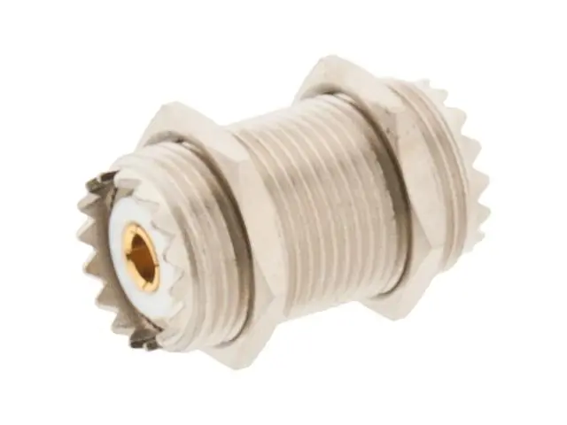 SO-239 dubbelhona för genomföring i panel. Längd: 28.6mm. Mittstift av guldpläterad mässing, dielektrikum av POM och hölje av nickelpläterad mässing.
