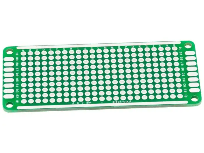 Electrokit ProtoPCB EKB08 är ett experimentkort med 230 genompläterade hål och två parallella längsgående ledningsbanor för strömförsörjning. Avsett för prototyputveckling, utbildning och tillverkning av mindre serier. Kortet är dubbelsidigt med ett rutnät av lödöar. Komponenter, integrerade kretsar och ledningsförbindelser kan monteras på båda sidor av kortet. Tillverkat i FR-4 glasfibermaterial vilket ger god mekanisk stabilitet och tål upprepad lödning. Kortet har ett referensrutnät med märkning i X- och Y-led, vilket är mycket användbart vid serietillverkning och dokumentation.