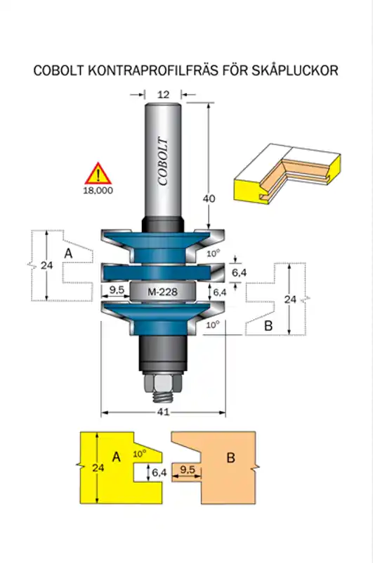 – Den övre delen (A) används för att göra den synliga dekorprofilen samt notspåret och den nedre delen (B) för att göra motprofilen (kontraprofil) och fjädern på kortsidorna i ramverkets tvärstycken. Tänk bara på att vända “rätt” sida mot fräsbordet.