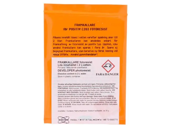 Framkallare för fotoresist 20 gram. För att framställa ett framkallningsbad blandas 20 gram framkallare med 2 liter vatten.