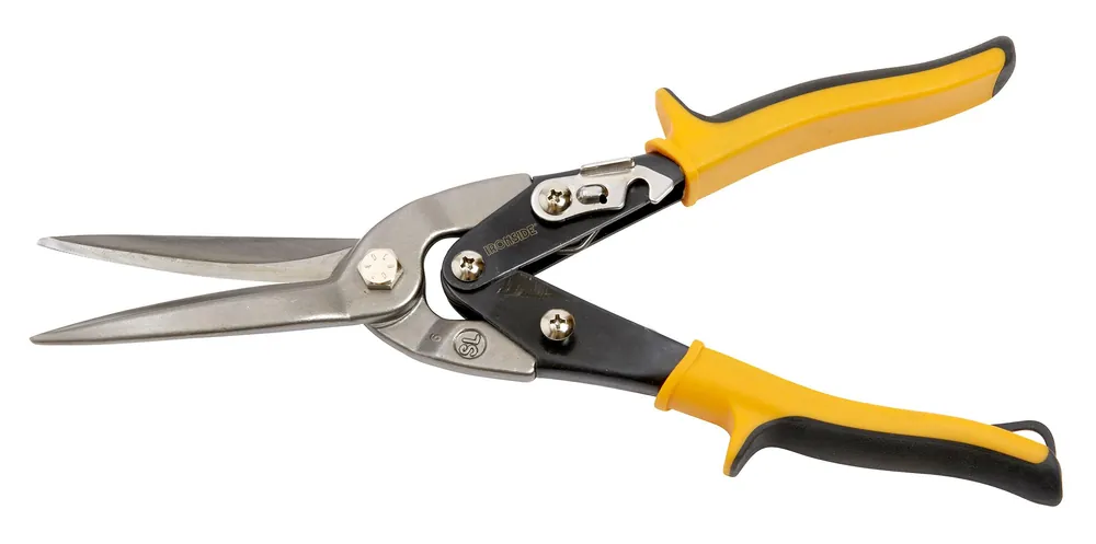 Fasonsax i lång modell med induktionshärdade HRC 60-62 blad. Rak modell med utväxling, för upp till 1.0 mm stålplåt och 0.5 mm rostfri plåt. Svagt tandade skär av molybdenstål.