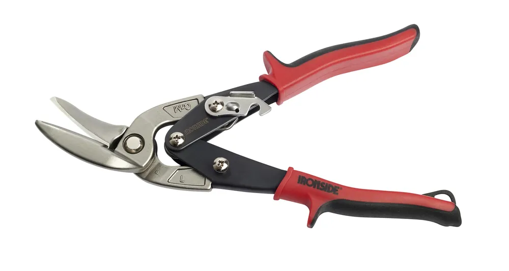 Fasonsax i vänstermodell med vinklat blad och utväxling. Skärens utformning och vinkling gör att handen hålls ovanför plåten vid klippning. Svagt tandade skär av molybdenstål. Induktionshärdad HRC 60-62.