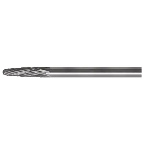 Roterande fil med spetsad form och rundad topp. För avgradnings- och formbearbetning. Mediumtandad med spånbrytare och tillverkad i hårdmetall.