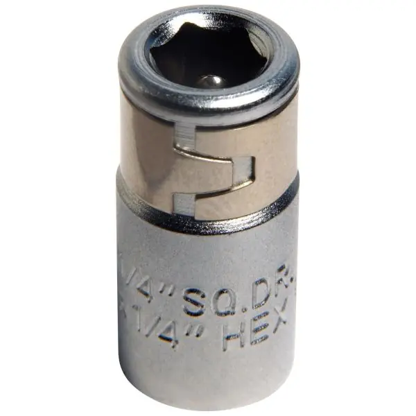 En bitsadapter som går från ett 1/4″ fyrkantsfäste till ett sexkantsfäste. Adaptern är i kromvanadinstål och är mattförkromad.