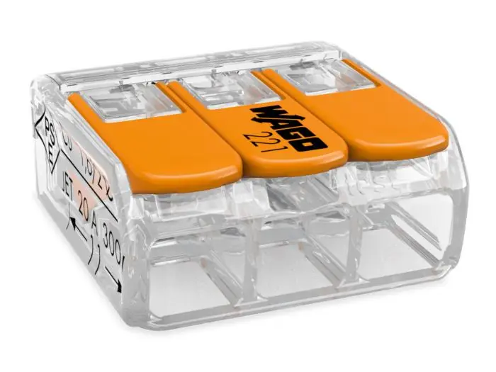 Skarvdon från Wago för enkel och snabb anslutning utan verktyg. Kontakten har 3 lägen för kablar, vilka är gemensamt anslutna. Passar de flesta kablar, både en- och flerkardeliga, från 0.2mm² till 4mm². Det transparenta höljet gör att man kan se så att ledarna har god anslutning.