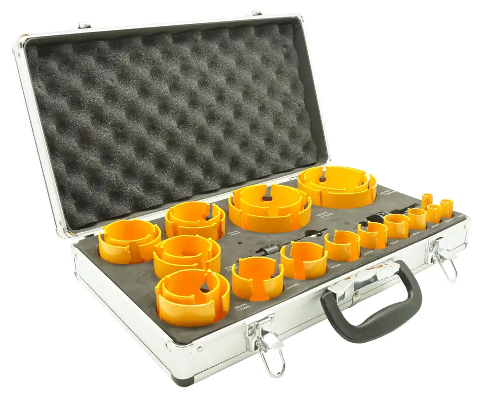 Hålsågsats med hårdmetalltänder, i storlekskombinationer avpassade för olika installationer och arbetsuppgifter. Kan även med fördel, med ett centrumborr med HM skär, också användas i sten/kakelmaterial upp till en hårdhet av 6. För Hål-i-Hål borrning använd adapter Ironside 100710.