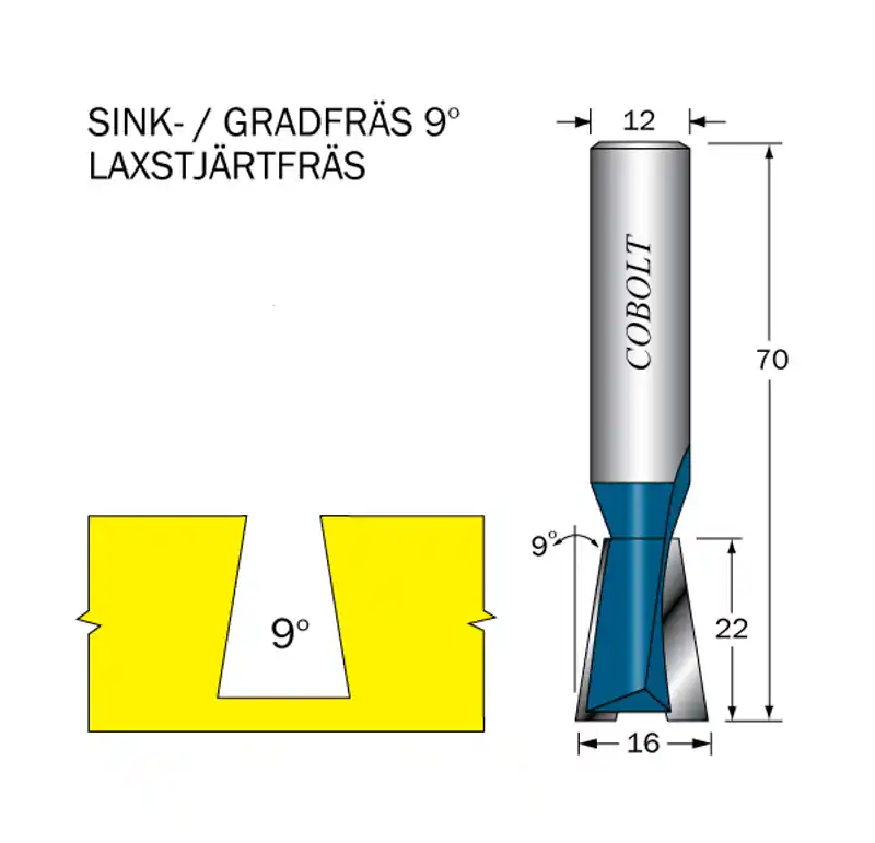 Sink-/gradfräs 9 grader laxstjärtfräs. För sinkfräsning vid sammanfogning av lådor, skåp etc.