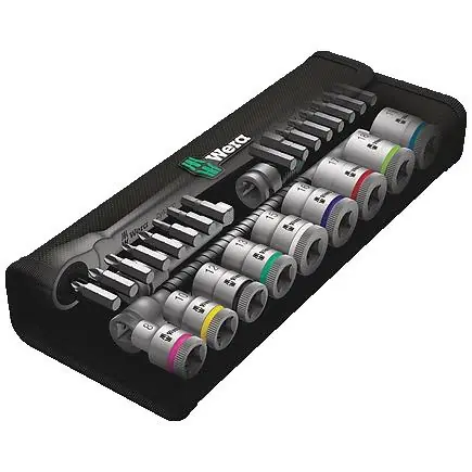 Kompakt spärrnyckelsats med 3/8″-fäste i 29 delar innehållande spärrskaft i metall, förlängning, adapter, hylsnycklar och bits. Levereras i praktiskt fodral.
