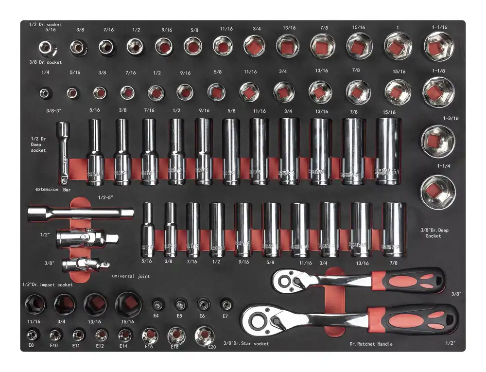 PELA 510931 är en hylsnyckelsats i 71 delar som innehåller verktyg i tum som är tillverkade av kromvanadiumstål och sorterade i skumgummiinlägg med bestämd plats och uppmärkning för varje verktyg. Satsen levereras i skummodul på 390x570x33 mm.