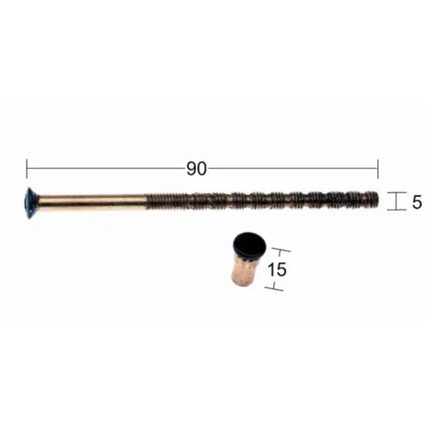 Klippbar 90mm skruv med hylsmutter av nickel för cylindervred och dörrhandtag. Gänga M5.