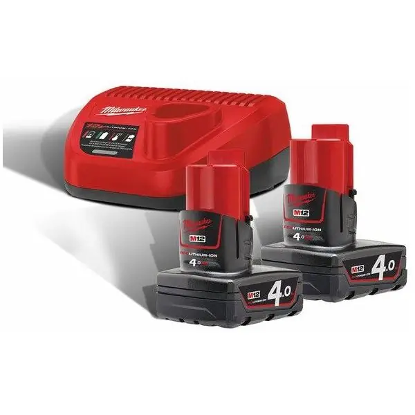 Ett laddpaket från Milwaukee innehållande 2 stycken 12V 4,0Ah litiumjonbatterier och laddaren M12-C12 C.