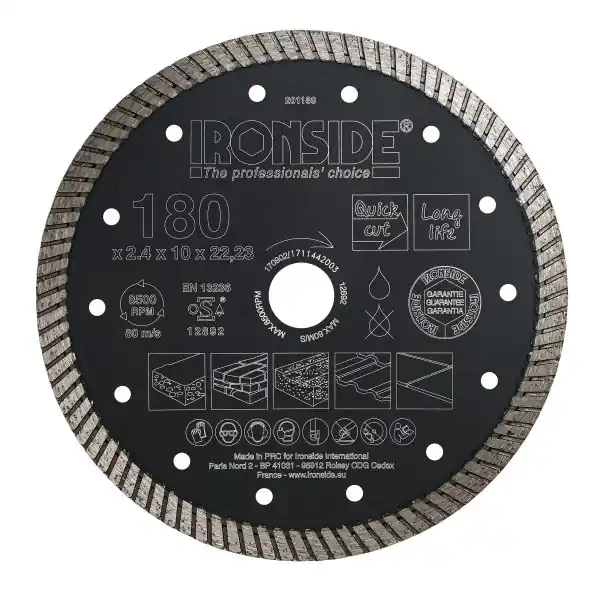 Diamantkapskiva på 180 x 22,23 x 2,4 x 10 mm med varmpressad sintring. Turbosegmentet minskar värmen och ökar damm avlägsnandet. Rekommenderas för tegelstenar, hårda byggnadsmaterial, sten och kakel.