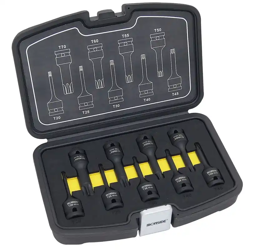 Sats med svartfosfaterade kraftbitshylsor med ½” anslutning. 78mm långa. Tar upp krafter och är synnerligen lämpliga för slående verktyg. Innehåll: Torx 20, 25, 30, 40, 45, 50, 55, 60, 70. Levereras i plastbox med EVA-skuminlägg.