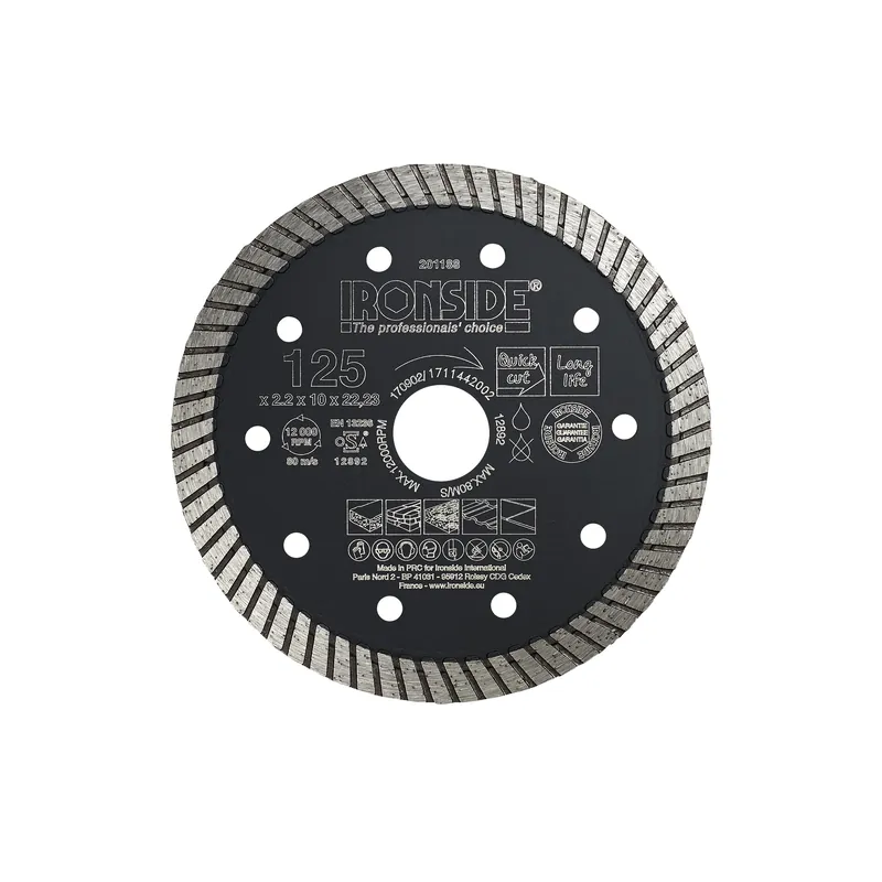 Diamantkapskiva på 180 x 22,23 x 2,4 x 10 mm med varmpressad sintring. Turbosegmentet minskar värmen och ökar damm avlägsnandet. Rekommenderas för tegelstenar, hårda byggnadsmaterial, sten och kakel.