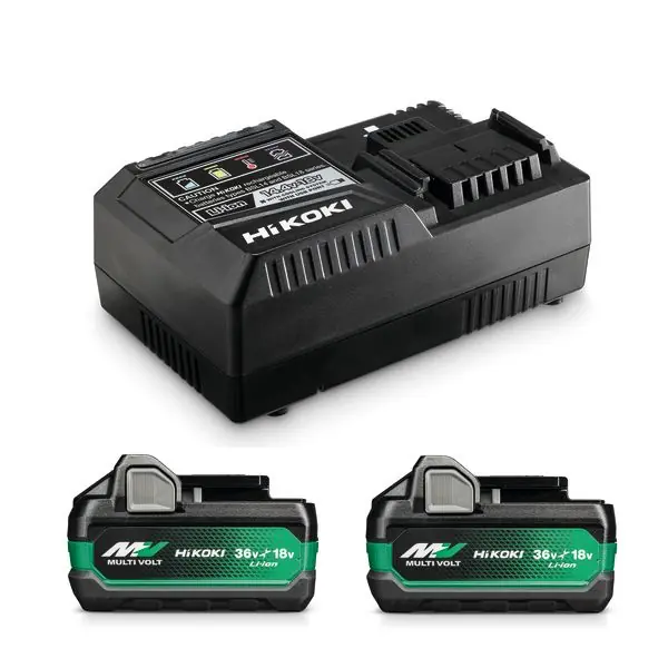 HIKOKI 68020923 är ett laddpaket som innehåller två MULTI VOLT-batterier och en snabbladdare. Batterierna är konstruerade för användning både i 18V-verktyg med en kapacitet på 5,0Ah och i 36V-verktyg med en kapacitet på 2,5Ah. Den smarta funktionen gör att batterierna automatiskt anpassar volt-nivån i förhållande till den maskin som används, vilket ger ökad flexibilitet och användarvänlighet.