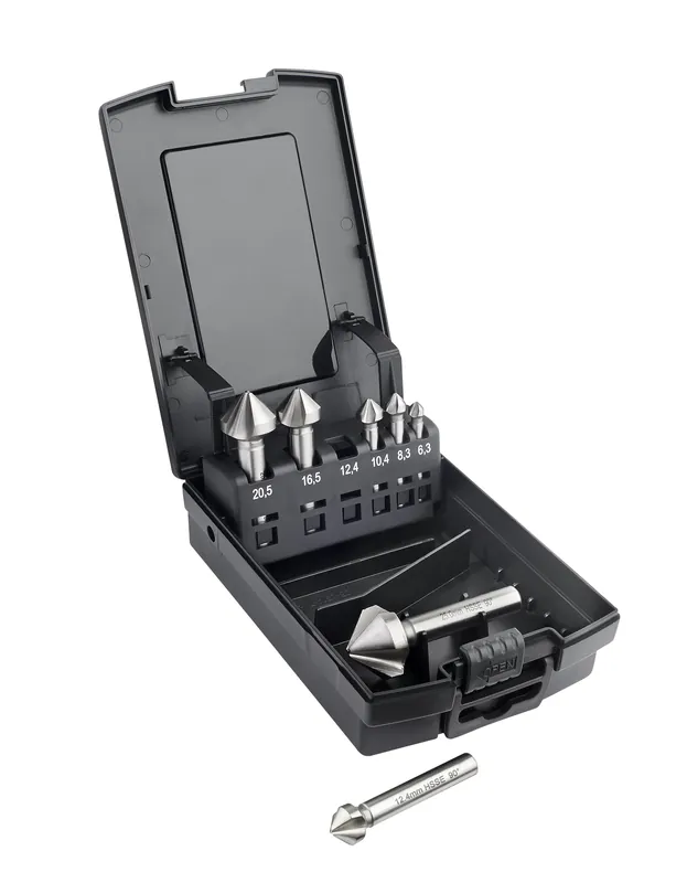 - 6 st. Försänkare, 3 skär, 90°: 6,3 mm, 8,3 mm, 10,4 mm, 12,4 mm, 16,5 mm, 20,5 mm