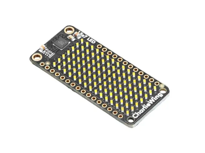 Expansionskort för Adafruit Feather-kort med en 15 x 7 pixels LED-matris. Matrisen är uppbyggd med diskreta lysdioder anslutna via en drivkrets till Feather. Vaje lysdiod kan styras separat och dimmas i 256 steg med enkla kommandon. Drivkretsen IS31FL3731 kommunicerar via I2C och har inbyggt RAM tillräckligt för att buffra 8st frames.