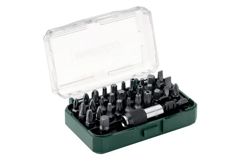Bestående av: S 2-bits, L= 25 mm. Bits i krom-vanadium-stål (S2-kvalitet), magnetisk bitshållare, med adapter för hylsnyckelinsatser (insticksnyckeladapter), högvärdig, robust box i speciell Metabo-design.